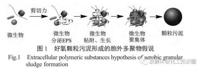 胞外多聚物(EPS)是微生物分泌的高分子物質,它能夠改變細胞表面的荷電性、疏水性,在好氧顆粒污泥形成過程中起著重要作用。EPS通過離子鍵、配位鍵等方式與微生物結合,促進細菌-細菌、細菌-固體的粘附,形成凝聚核;粘附的微生物持續(xù)生長、繁殖,顆粒不斷增大,在外力的作用下形成規(guī)則、穩(wěn)定的顆粒污泥(圖1)。