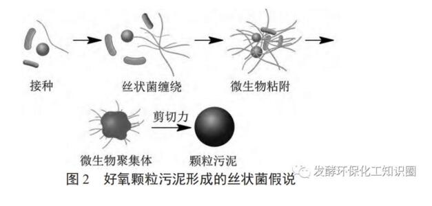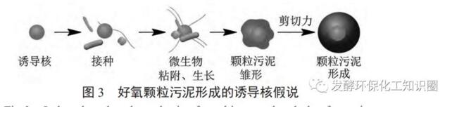 誘導核假說認為污泥顆?;^程以誘導核為基礎,微生物在誘導核表面附著、聚集、生長,最終形成成熟的顆粒污泥(圖3)。